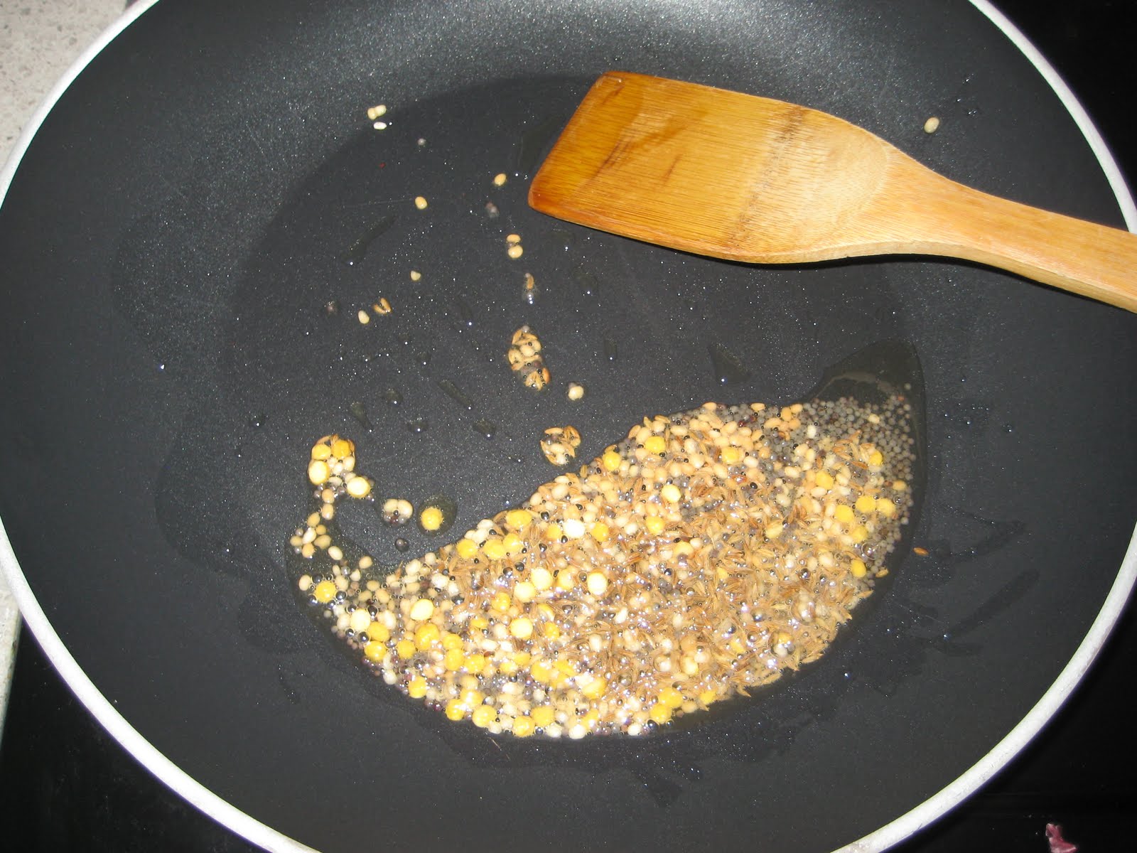 3. Heat a pan on medium heat. Add oil. Once hot, add the mustard seeds.
