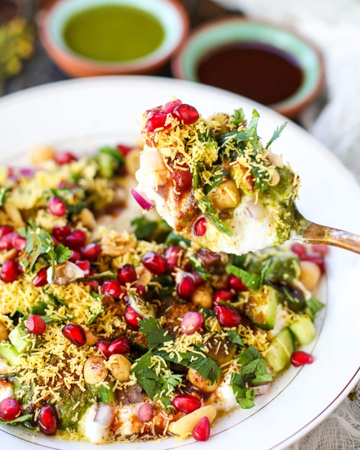 - Start by adding Greek yogurt to a bowl, then top with chickpeas and chopped red onions. Add chopped cucumber, followed by cilantro chutney and tamarind chutney, and sprinkle in peanuts. Season with kala namak, dry roasted cumin, and red chili powder, then garnish with fresh cilantro. Finish by topping with fine sev and pomegranate seeds for that perfect crunch and burst of flavor. Enjoy!