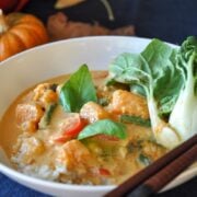 Top with Thai basil leaves and baby bok choy. The heat of the sauce will wilt the bok choy. Serve Thai Butternut Squash Red Curry with brown rice.